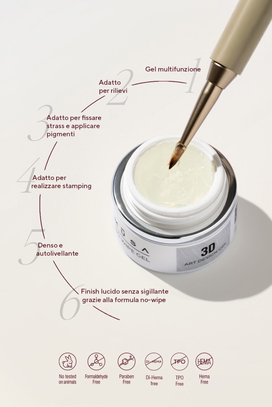 Con 3D Art Design Gel โ No Wipe puoi creare decorazioni in rilievo perfette, fissare strass, applicare pigmenti e persino realizzare stamping con un solo prodotto.