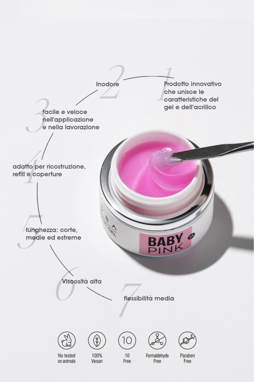 Acrylic Gel รจ un prodotto ibrido rivoluzionario che unisce le caratteristiche fondamentali del gel e dellโacrilico, in particolar modo la facilitร di lavorazione dellโacrilico e la polimerizzazione in lampada del gel. Grazie alla sua consistenza il prodotto non cola e offre la possibilitร di essere lavorato con facilitร e precisione contemporaneamente su tutte le unghie. Puรฒ essere utilizzato per effettuare ricostruzioni, allungamenti e refill, frammenti mancanti dellโunghia, ricostruzioni per unghie onicofagiche. La speciale formula rende lโunghia piรน forte, piรน flessibile e piรน leggera degli acrilici e dei gel tradizionali. Il risultato รจ un effetto totalmente naturale e una lunghissima durata per oltre 21 giorni. Perfetto per la tecnica del french inverso. Acrylic Gel รจ molto resistente ma nello stesso tempo flessibile sullโunghia. Pinzabile e adatto a tutti i tipi di lunghezze. Pochissima polvere di limatura. Ideale per effettuare correzioni su unghie grifotiche senza dover utilizzare le Nail Form. Non genera calore in lampada. La sua colorazione rosa baby abbinata a una viscositร altissima e molto facile da lavorare si combina perfettamente con la sua resistenza per dei trattamenti a lunga durata. ย Per uso professionale.