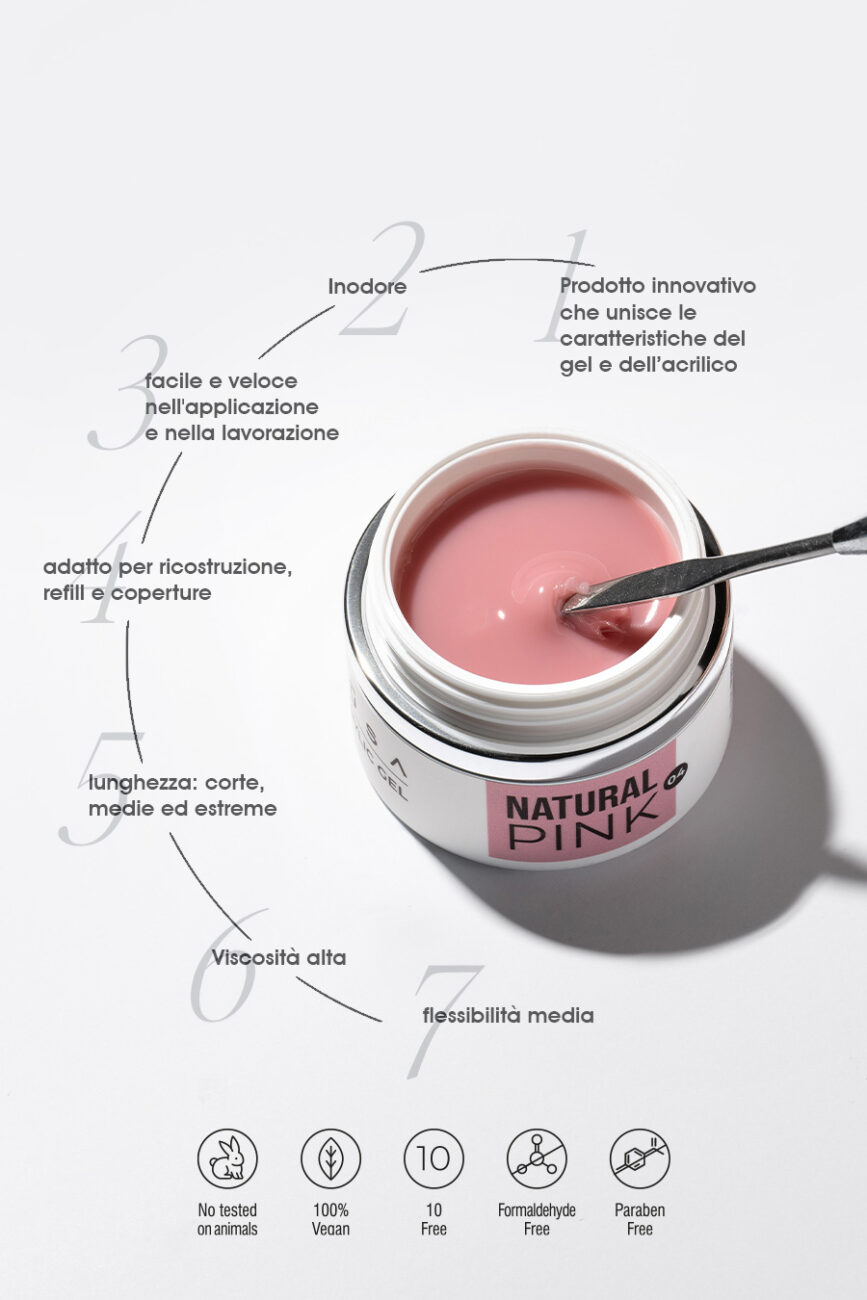 Non genera calore in lampada. La sua naturale tonalitร rosata abbinata a una viscositร altissima e molto facile da lavorare si combina perfettamente con la sua resistenza per dei trattamenti a lunga durata.