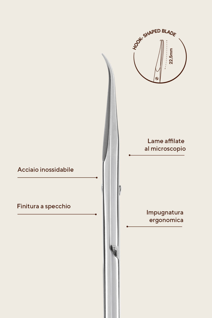 Strumento di precisione progettato per la rimozione delicata e accurata delle cuticole, grazie alla lama ad uncino.
