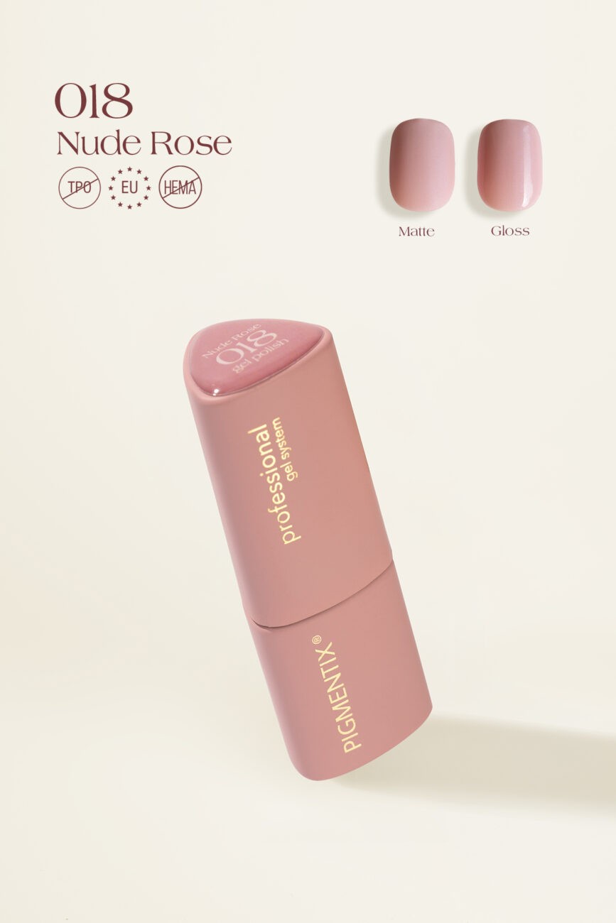 PIGMENTIX® 018 Nude Rose è un gel polish ricco, intenso ed estremamente pigmentato, HEMA & DI-HEMA FREE e TPO FREE, con formula gel al 100%.