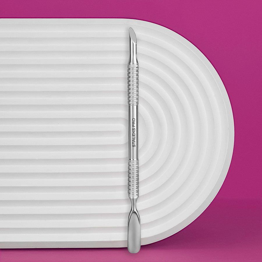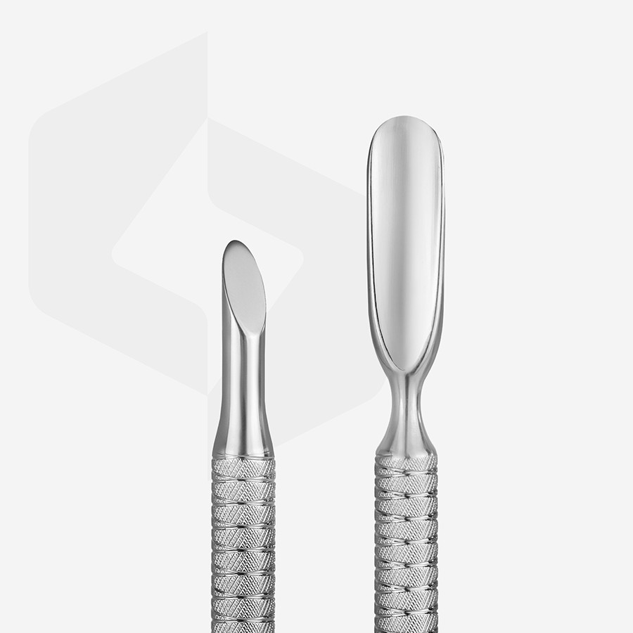 Strumento in acciaio inox con doppia curette. Ad un’estremitร รจ tonda e all’altra piatta. Perfetto per pedicure.